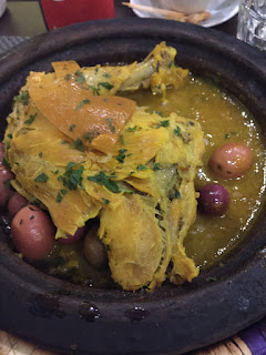 Comemos um conjunto de saladas marroquinas (todas deliciosas e ingredientes pouco habituais), tajine de frango (tipico prato do Norte de África, que consiste numa espécie de estufado), e para as crias, uma espécie de espetada de frango, com sabor a especiarias.